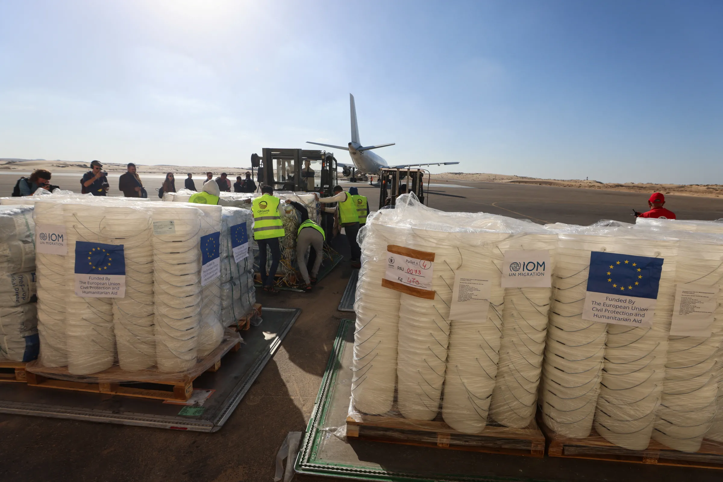 Workers move humanitarian aid destined for the Gaza Strip via Rafah border area, during a temporary truce between Palestinian Islamist group Hamas and Israel, at Al Arish airport, in Al Arish, Egypt, November 30, 2023. REUTERS/Mohamed Abd El Ghany