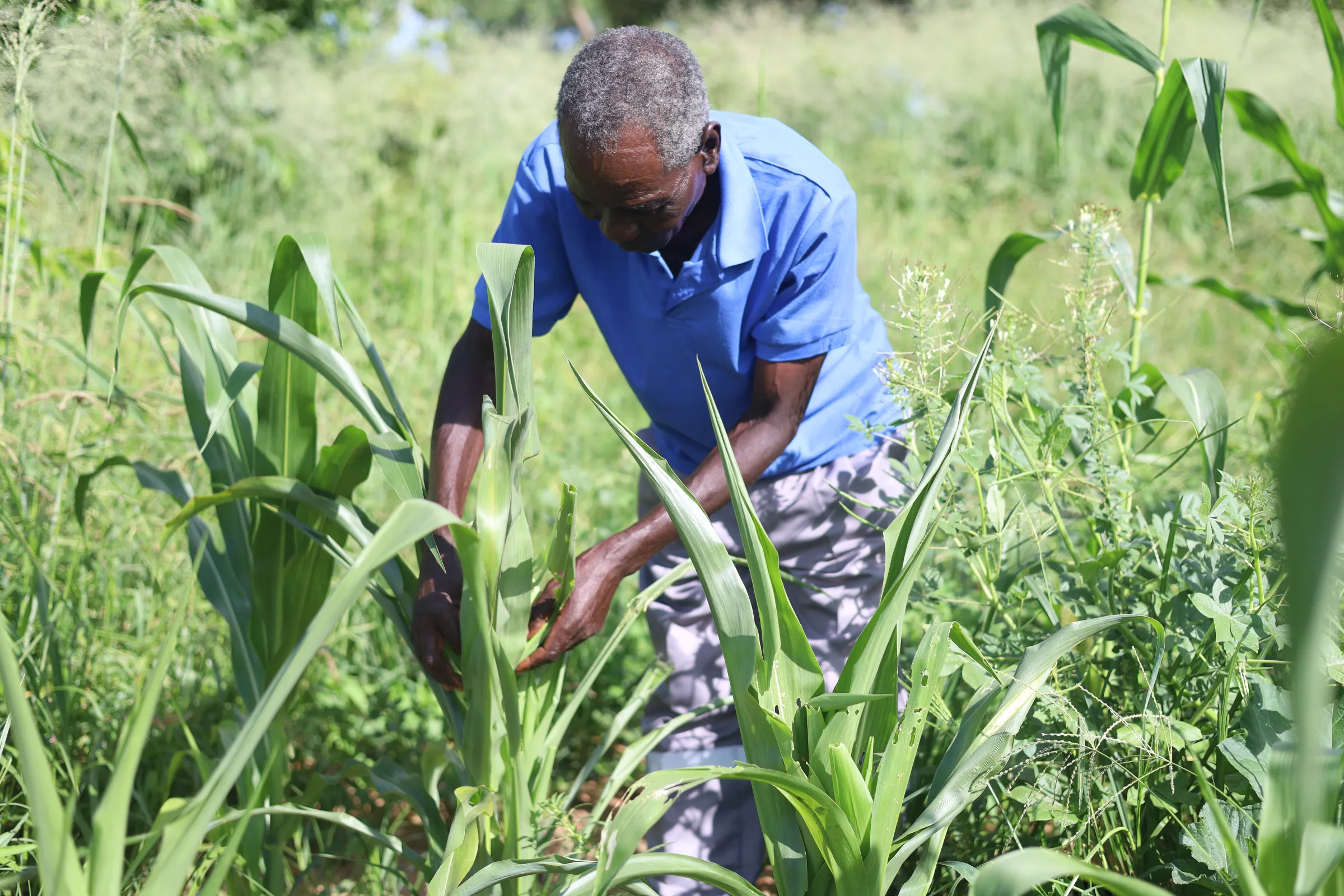 Farmer Simon Manguri picks fall armyworm off his maize crops in Rushinga, Zimbabwe, Feb. 18, 2025. Thomson Reuters Foundation/Farai Shawn Matiashe