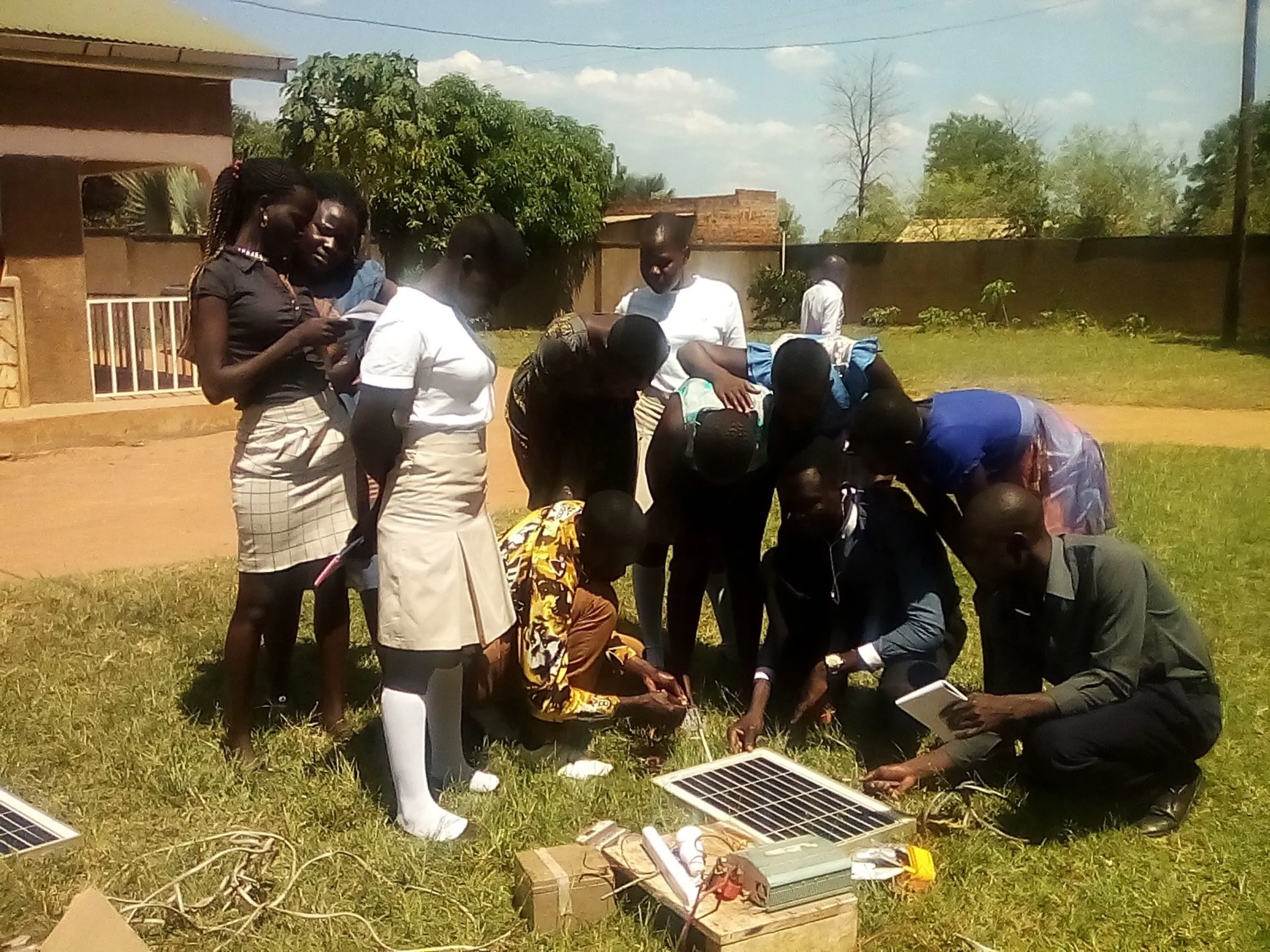 People gather around a solar panel during a training session run by BOSCO in Kitgum in Uganda. Thomson Reuters Foundation/Handout courtesy of BOSCO